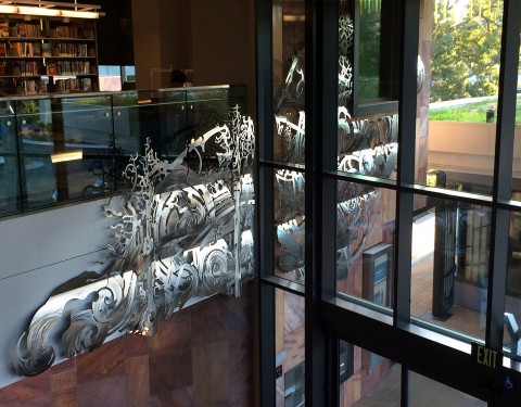 Cloud Forest is located in the entry of Palo Alto’s new state-of-the-art Mitchell Park Library. Inspired by the redwood tree which is the symbol of Palo Alto, the sculpture is an abstracted interpretation of the unique exchange between the coastal redwoods & Pacific Ocean marine layer.  If one looks they can find images within the lacy steel pattern; clouds, birds, seeds, unfurling sprouts, branch bifurcation and more. The steel curves subtly “billow” from the walls to join with the hand-brushed finishes in creating uncommon light reflections. These complex patterns of light & steel signify the worlds within worlds found inside the Library.